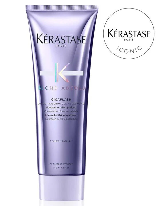 El Acondicionador Cicaflash Blond Absolu con Ácido Hialurónico de Kérastase es un acondicionador fortificante intenso que suaviza el cabello y previene el quiebre para todo tipo de cabello rubio.